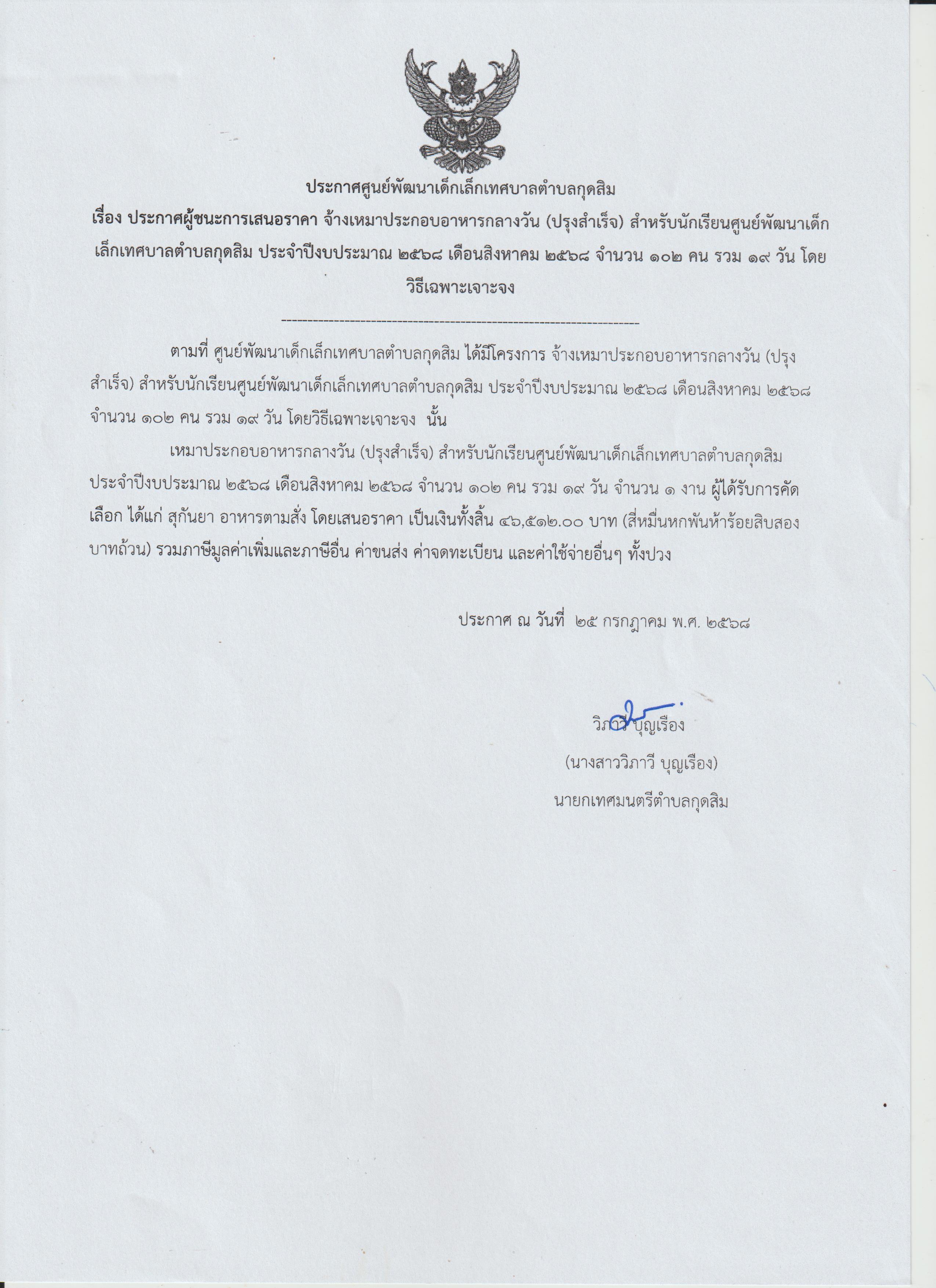 ประชาสัมพันธ์ ประกาศผู้ชนะการเสนอราคา จ้างเหมาประกอบอาหารกลางวัน (ปรุงสำเร็จ) สำหรับนักเรียนศูนย์พัฒนาเด็กเล็กเทศบาลตำบลกุดสิม ประจำปีงบประมาณ 2568 เดือนสิงหาคม 2568 จำนวน 19 วัน โดยวิธีเฉพาะเจาะจงลงข่าว :
