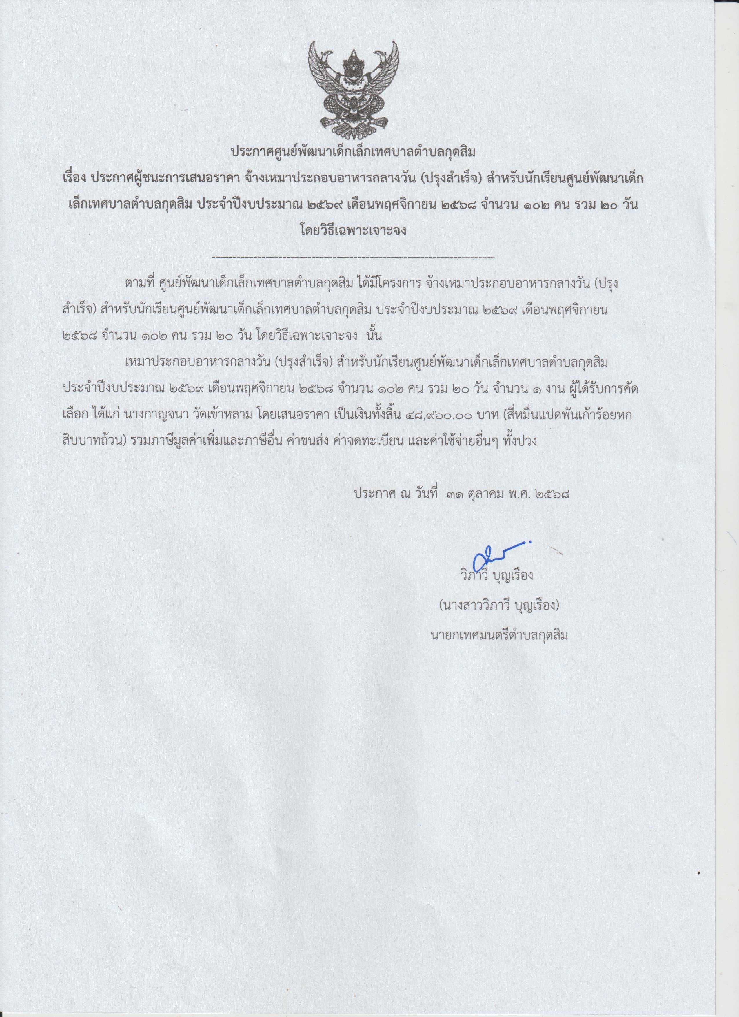 ประชาสัมพันธ์ ประกาศผู้ชนะการเสนอราคา จ้างเหมาประกอบอาหารกลางวัน (ปรุงสำเร็จ) สำหรับนักเรียนศูนย์พัฒนาเด็กเล็กเทศบาลตำบลกุดสิม ประจำปีงบประมาณ 2569 เดือนพฤศจิกายน 2568 จำนวน 20 วัน โดยวิธีเฉพาะเจาะจงลงข่าว :