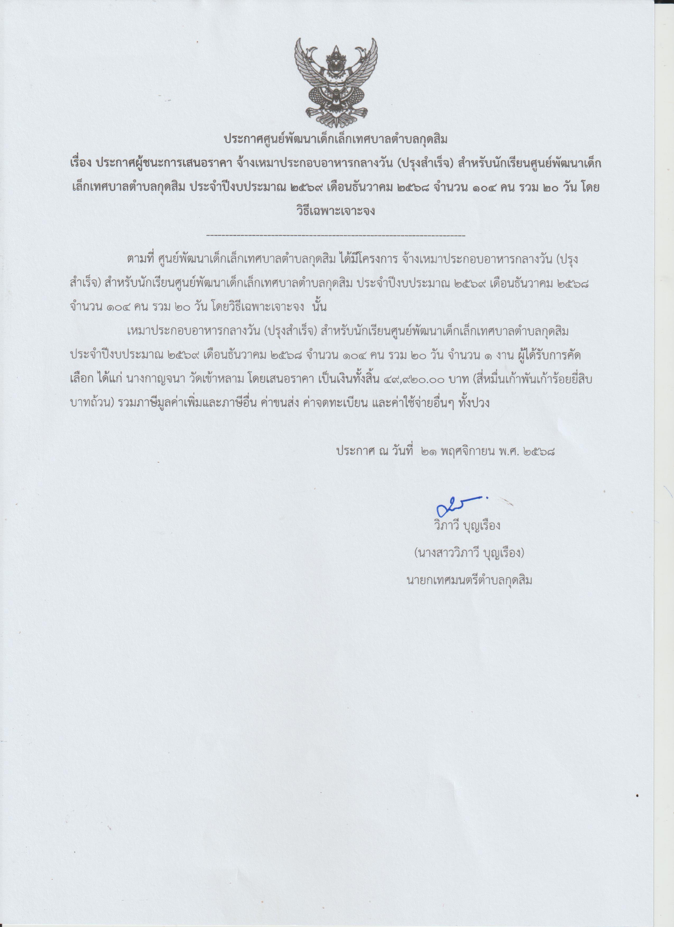 ประชาสัมพันธ์ ประกาศผู้ชนะการเสนอราคา จ้างเหมาประกอบอาหารกลางวัน (ปรุงสำเร็จ) สำหรับนักเรียนศูนย์พัฒนาเด็กเล็กเทศบาลตำบลกุดสิม ประจำปีงบประมาณ 2569 เดือนธันวาคม 2568 จำนวน 20 วัน โดยวิธีเฉพาะเจาะจงลงข่าว :