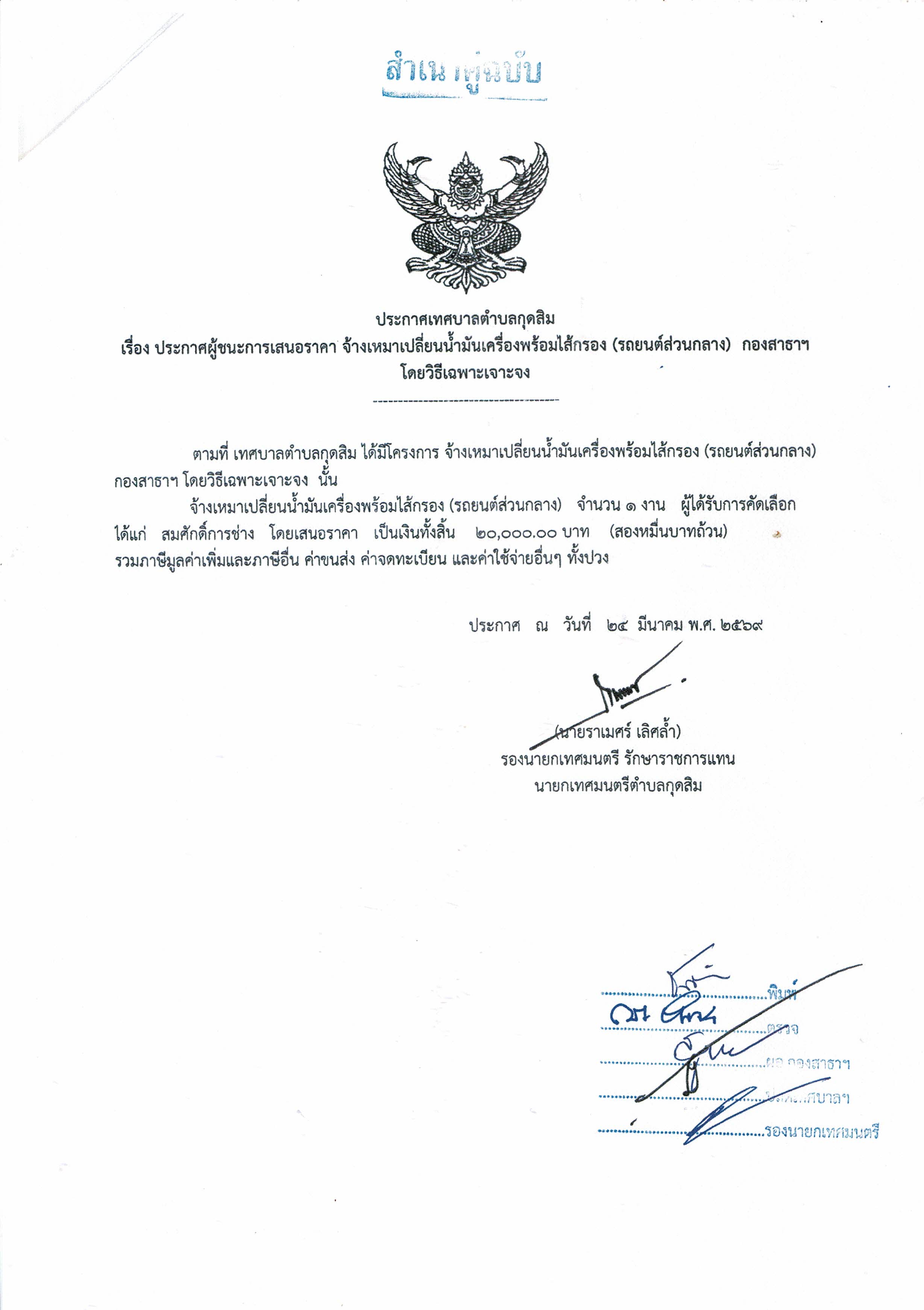 ประกาศผู้ชนะการเสนอราคา จ้างเหมาเปลี่ยนน้ำมันเครื่องพร้อมไส้กรอง