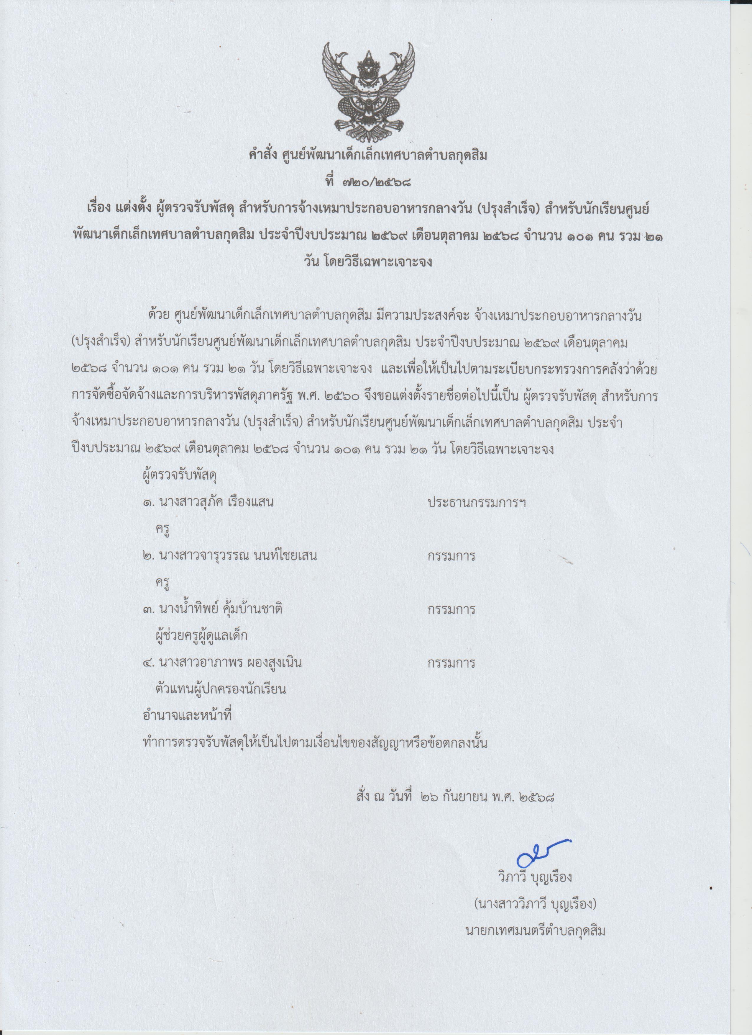ประชาสัมพันธ์ ประกาศผู้ชนะการเสนอราคา จ้างเหมาประกอบอาหารกลางวัน (ปรุงสำเร็จ) สำหรับนักเรียนศูนย์พัฒนาเด็กเล็กเทศบาลตำบลกุดสิม ประจำปีงบประมาณ 2569 เดือนตุลาคม 2568 จำนวน 21 วัน โดยวิธีเฉพาะเจาะจงลงข่าว :
