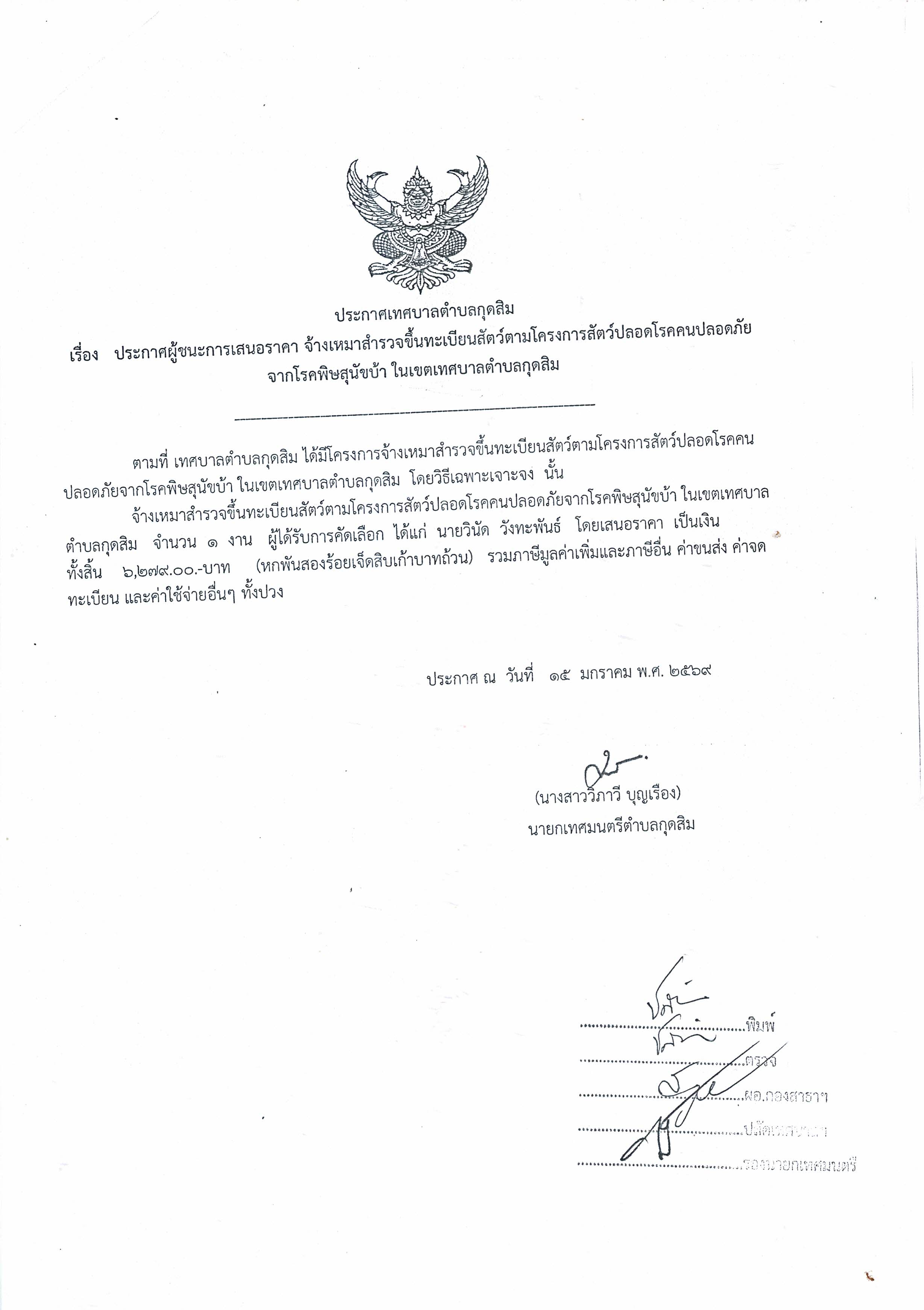 ประกาศ เรื่องประกาศผู้ชนะการเสนอราคา จ้างเหมาสำรวจขึ้นทะเบียนสัตว์ปลอดโรคคนปลอดภัยจากโรคพิษสุนัขบ้า ในเขตเทศบาลตำบลกุดสิม